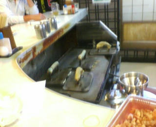 鉄板で、さらに上からおさえて焼いてます。